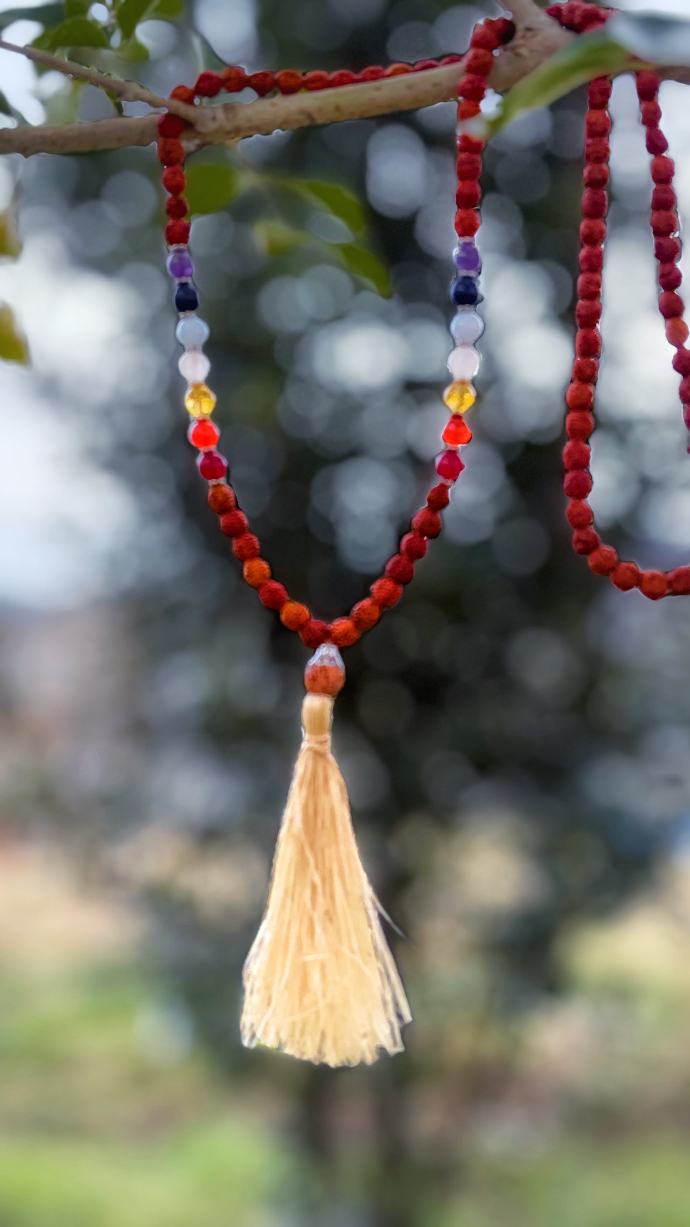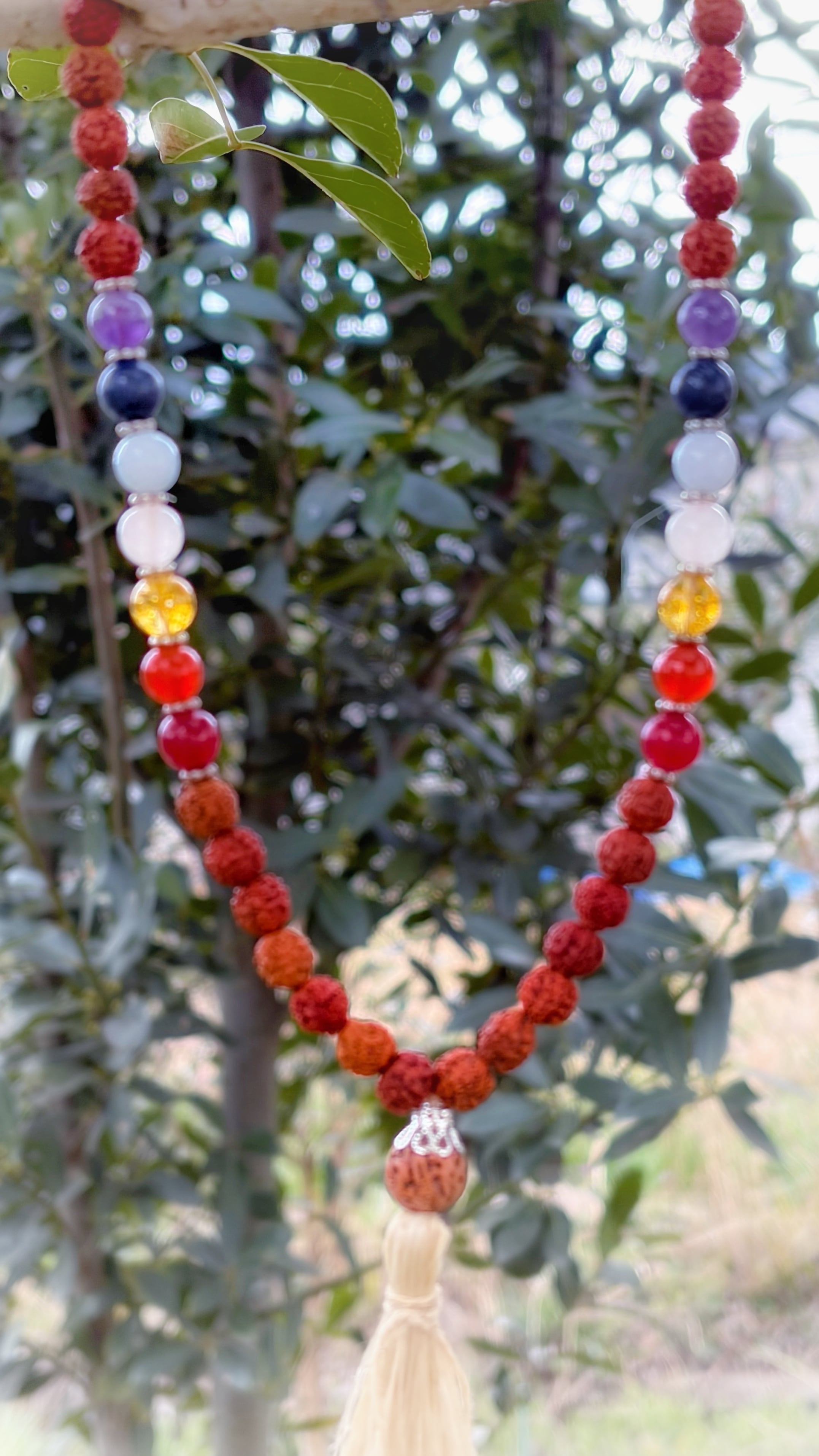 心を整え、エネルギーの流れを調整するためにデザインされたこの念珠は、ルドラクシャと精麻を組み合わせ、7つのチャクラに対応しています。