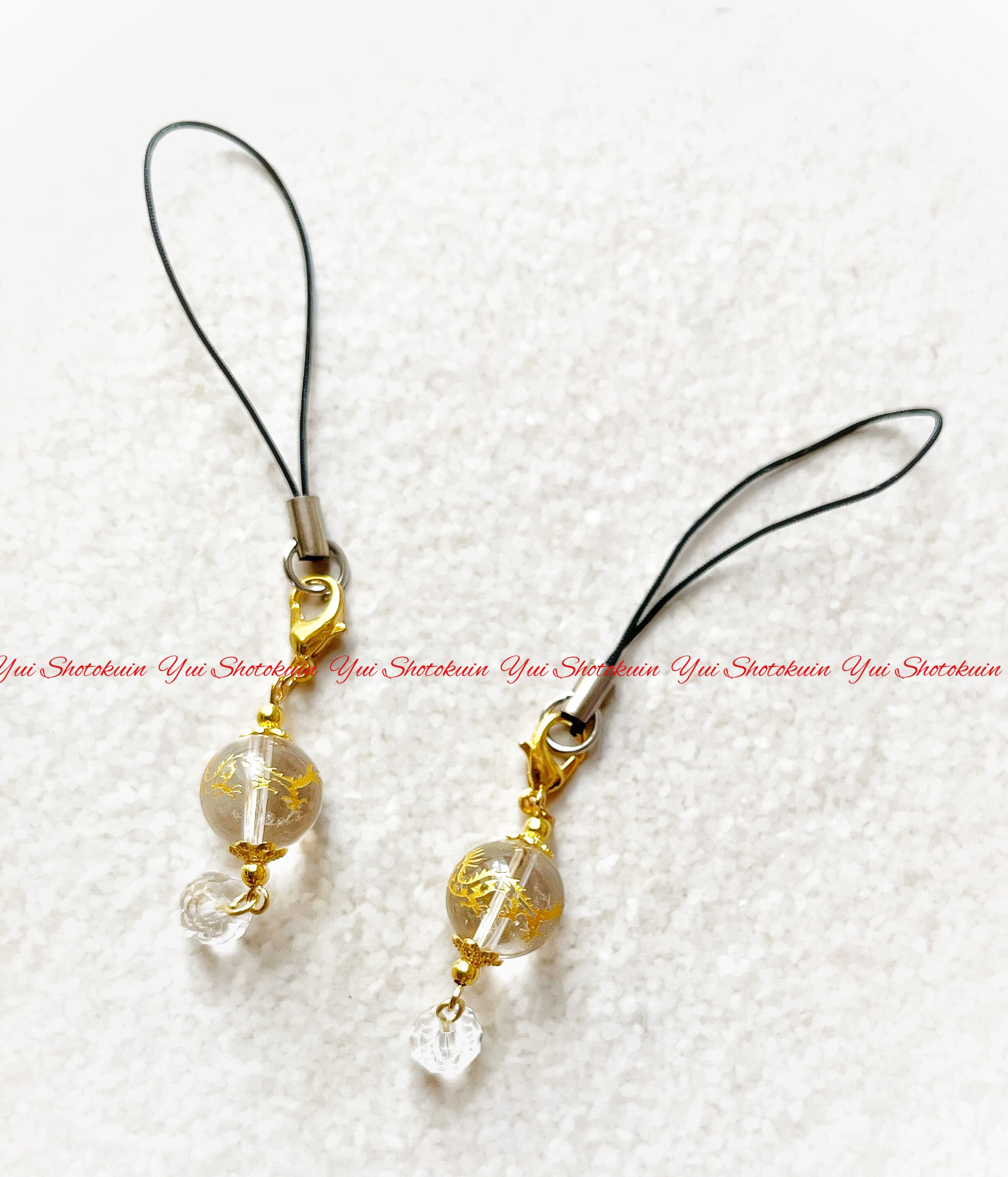 浄化能力を持ち魔除けやお守りとして古来より大切にされてきた幸運と浄化の水晶にそれぞれ青龍・朱雀の金彫りを施したストラップです。